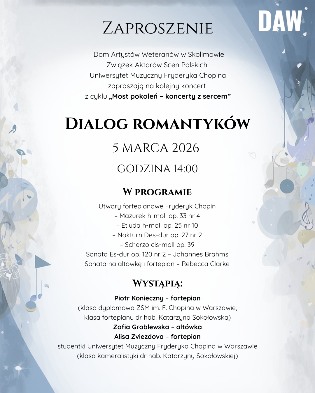 Tym razem zapraszamy Państwa na muzyczny „Dialog romantyków” – spotkanie pełne emocji, pasji i liryzmu, w którym młodość i artystyczna wrażliwość połączą się z dojrzałością romantycznej ekspresji.
