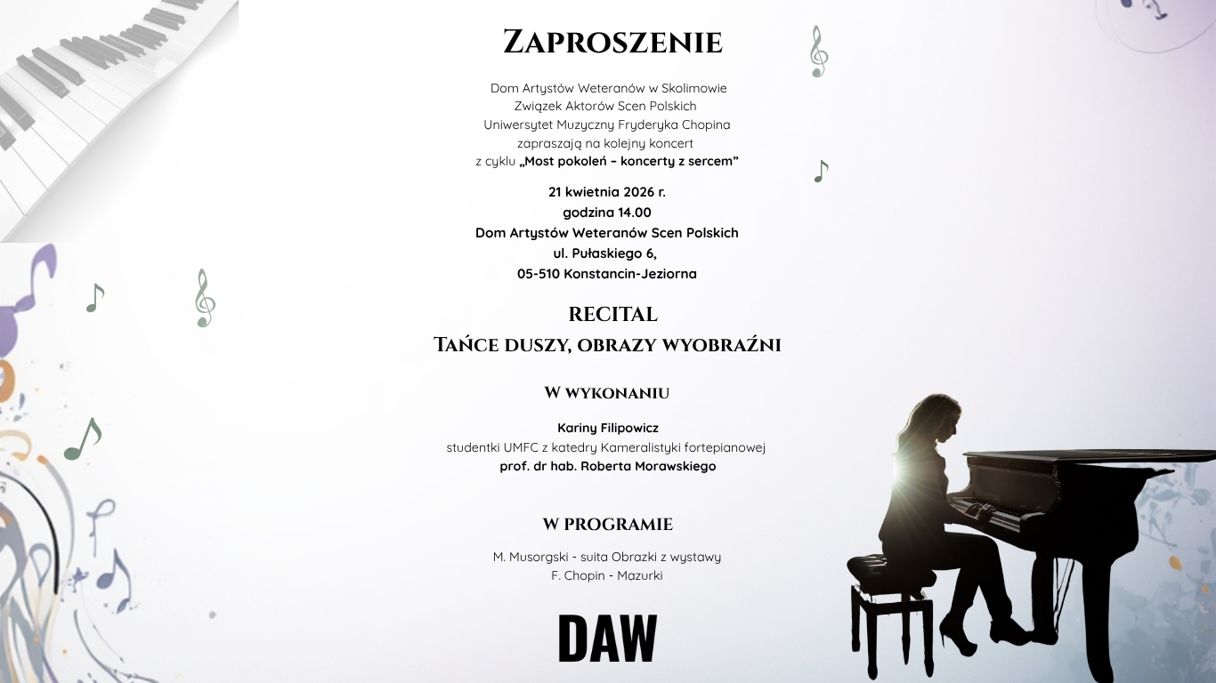 W ramach cyklu „Most pokoleń – koncerty z sercem” serdecznie zapraszamy na wyjątkowy recital pianistyczny zatytułowany „Tańce duszy, obrazy wyobraźni”, który odbędzie się 21 kwietnia 2026 roku.