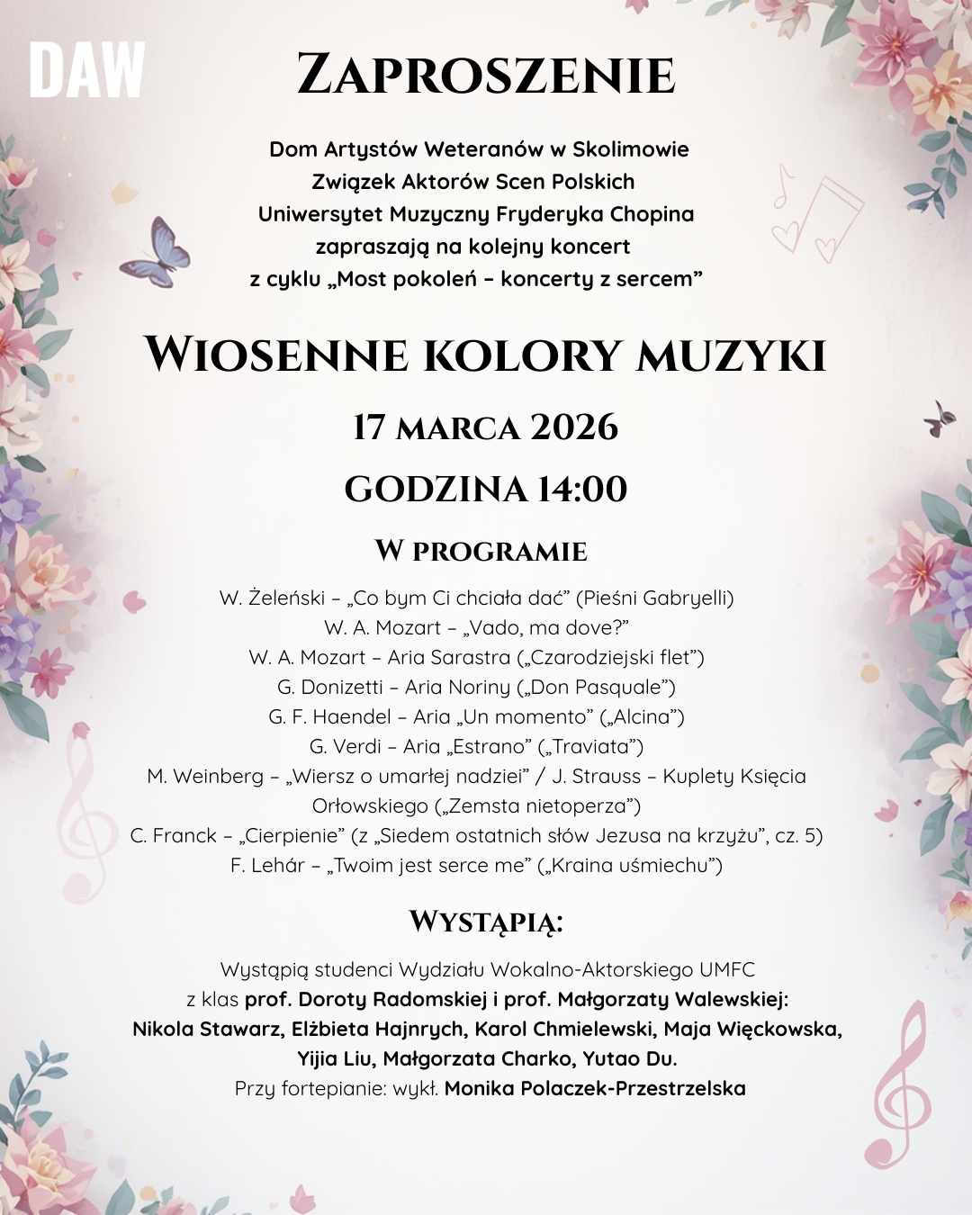 Serdecznie zapraszamy na koncert wokalny „Wiosenne kolory muzyki”, który odbędzie się w Domu Pomocy Społecznej Artystów Weteranów Scen Polskich im. Wojciecha Bogusławskiego.