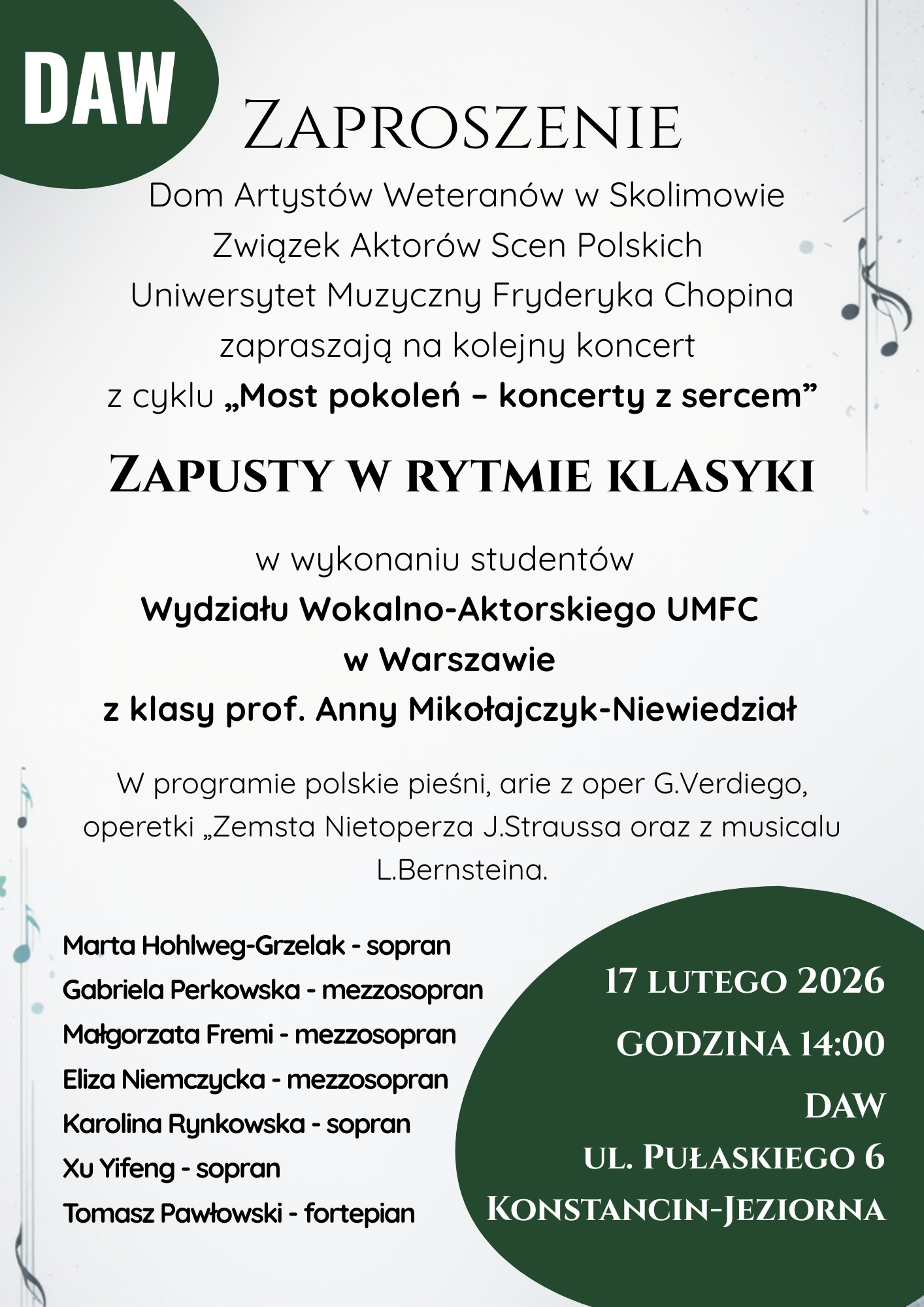 Zapraszamy na koncert „Zapusty w rytmie klasyki”, który odbędzie się 17 lutego 2026 o godz. 14:00 w Domu Artystów Weteranów w Skolimowie. Wydarzenie jest częścią cyklu „Most pokoleń – koncerty z sercem” i powstaje we współpracy z Związkiem Artystów Scen Polskich (ZASP), Uniwersytetem Muzycznym Fryderyka Chopina oraz DAW.